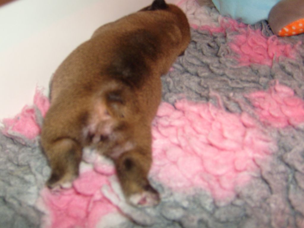 Femelle fauve charbonné, forte ossature, plastron blanc, queue recouvrant l'anus